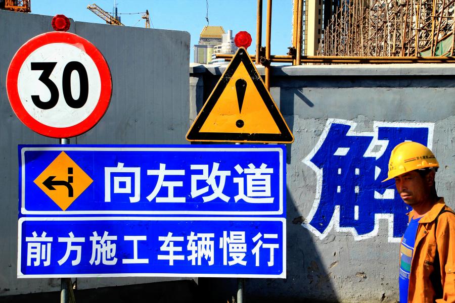Start Up – A Worker Passes By a Construction Sign At Shanghai's Old Tow
